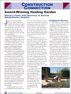 Schwab Rehabilitation Hospital is a 120-bed facility on the near west side of Chicago, offering physical medicine and rehabilitation. An addition to the hospital was built in 1998, and now, atop its fourth-floor roof, there is a 10,000- square-foot healing garden featuring 6,000 square feet of planting beds. Construction on the garden began in spring 2003 and was completed that fall.