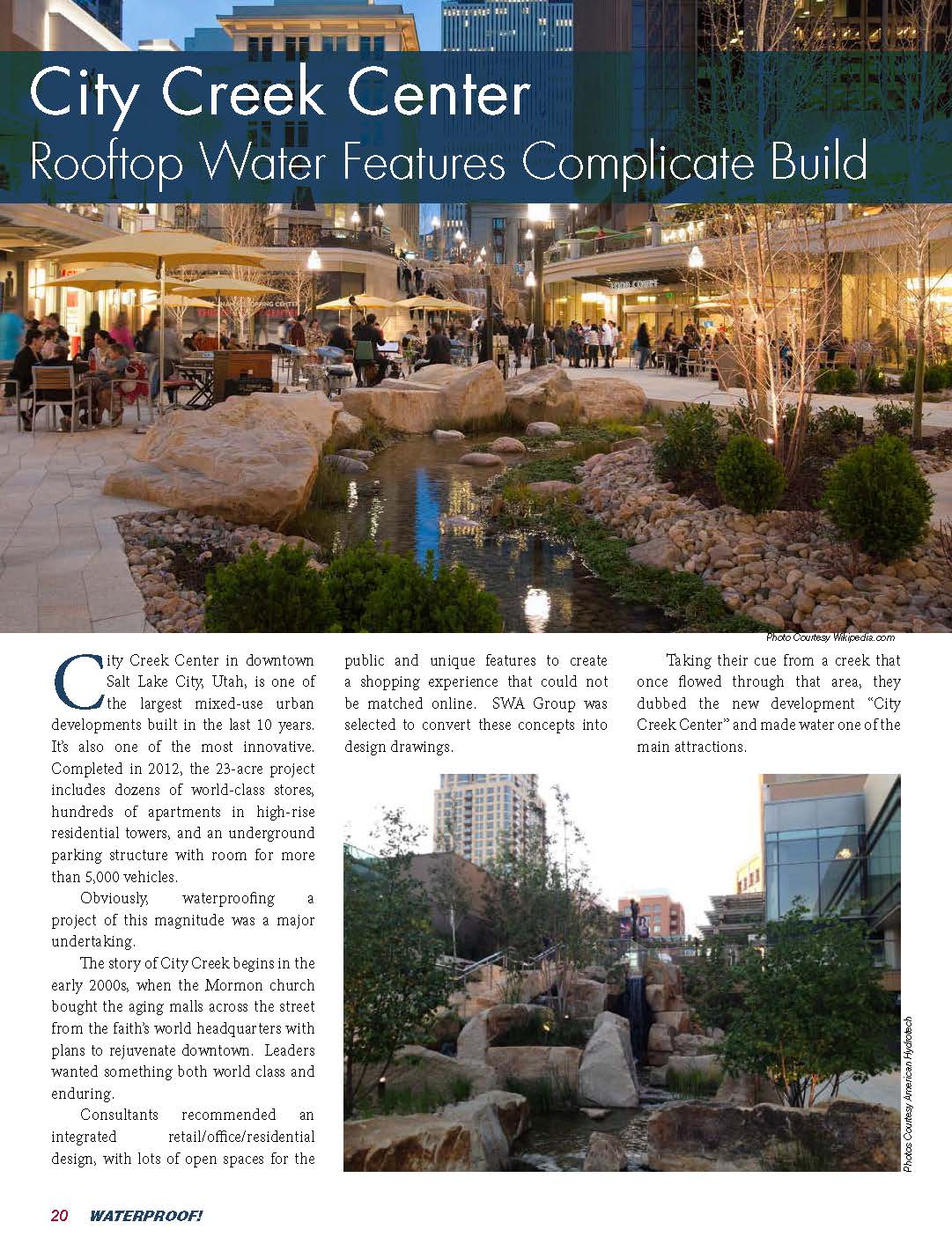 CHICAGO, ILLINOIS (July 1, 2016) City Creek Center in downtown Salt Lake City, Utah, is one of the largest mixed-use urban developments built in the last 10 years. It's also one of the most innovative. Completed in 2012, the 23-acre project includes dozens of world-class stores, hundreds of apartments in high-rise residential towers, and an underground parking structure with room for more than 5,000 vehicles. Obviously, waterproofing a project of this magnitude was a major undertaking.