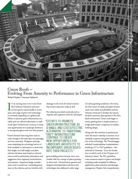 It’s an exciting time to be in the Green Roof industry. Education and interest have grown exponentially in recent years, and usage of green roof technology is constantly expanding on a global scale. Efforts to promote green infrastructure as a viable and cost-effective alternative to traditional “grey” infrastructure continue to create new opportunities for Landscape Architects to incorporate green roofs into their projects.