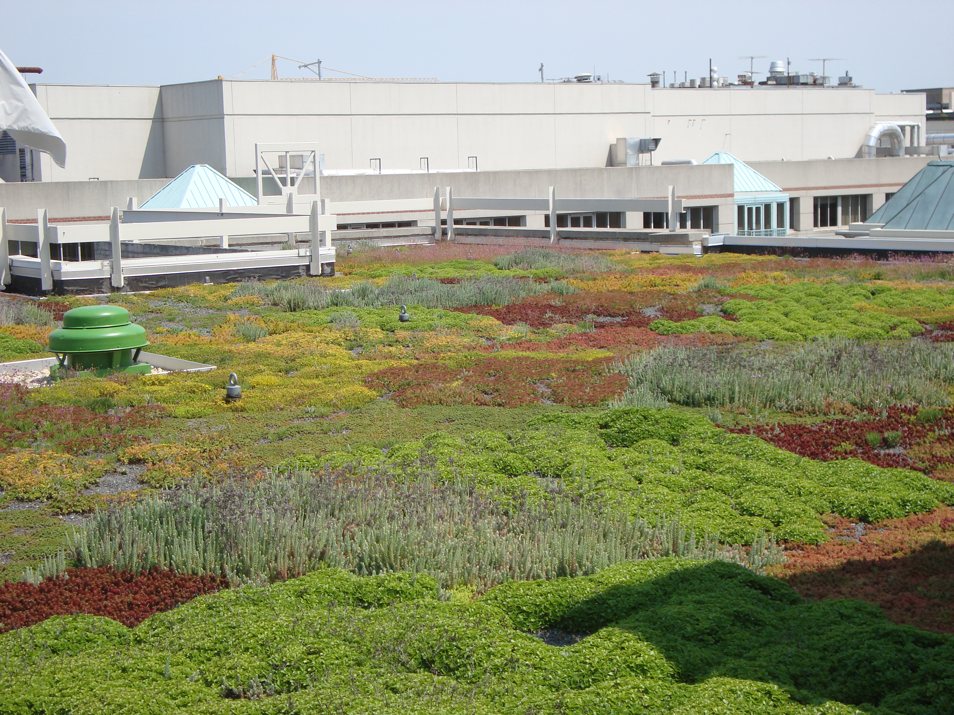 Green roofs filter particulate matter and chemicals through the plants, growing media, system filter, and drainage layers, mimicking natural hydrology systems such as wetlands and similar structures.