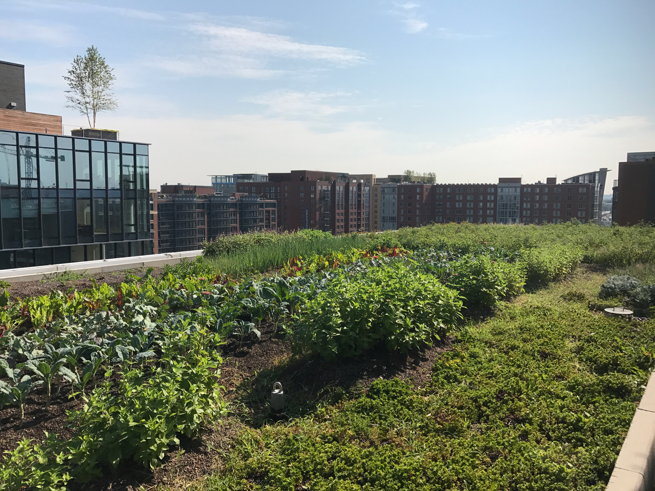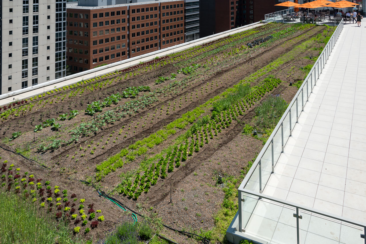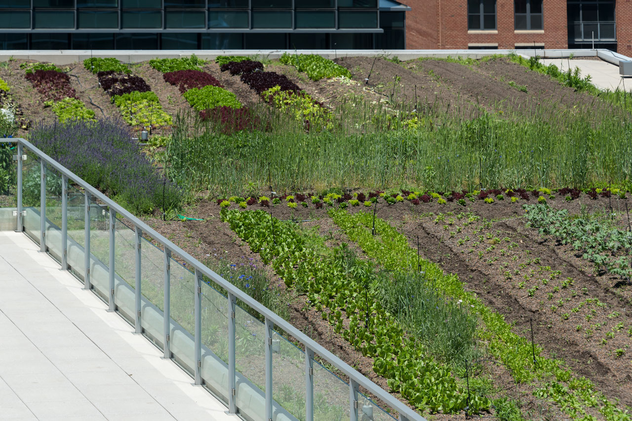 This modern, airy structure quickly attracted a number of businesses, retail and food operations due to its convenient location, use of recycled building materials, massive parking options and overall stunning façade. The structure originally featured a 20,000 sf intensive green roof, which was then converted into an urban agriculture environment in April 2017. This revamped American Hydrotech Ultimate and Garden Roof Assembly now produces tomatoes, peppers, greens and a variety of cut flowers. The rooftop farm is managed and operated by Up Top Acres, an organization that distributes food and other products from rooftop farms to co-ops, restaurants and markets in the greater-D.C. area.