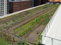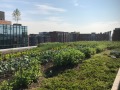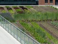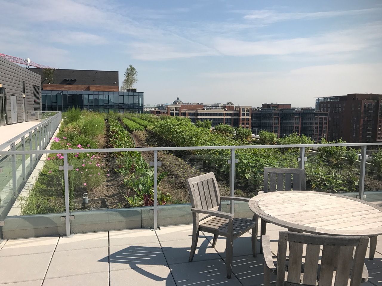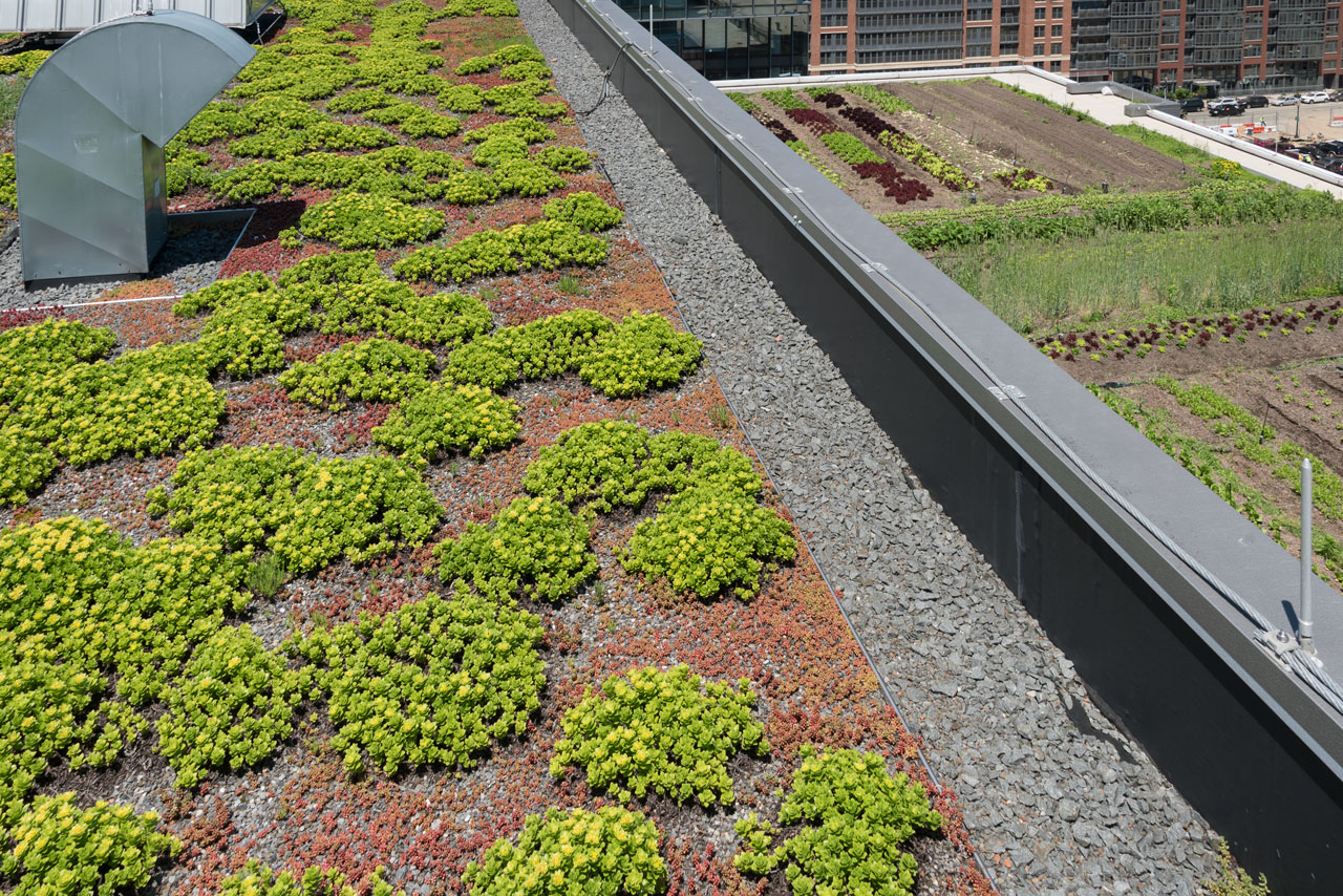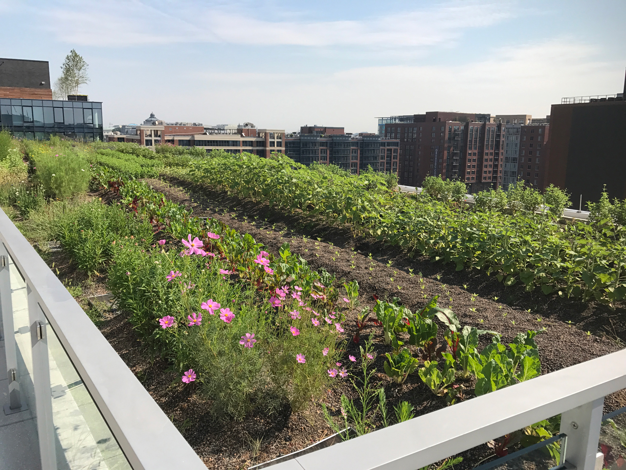 This modern, airy structure quickly attracted a number of businesses, retail and food operations due to its convenient location, use of recycled building materials, massive parking options and overall stunning façade. The structure originally featured a 20,000 sf intensive green roof, which was then converted into an urban agriculture environment in April 2017. This revamped American Hydrotech Ultimate and Garden Roof Assembly now produces tomatoes, peppers, greens and a variety of cut flowers. The rooftop farm is managed and operated by Up Top Acres, an organization that distributes food and other products from rooftop farms to co-ops, restaurants and markets in the greater-D.C. area.
