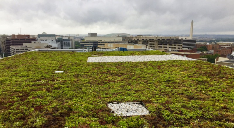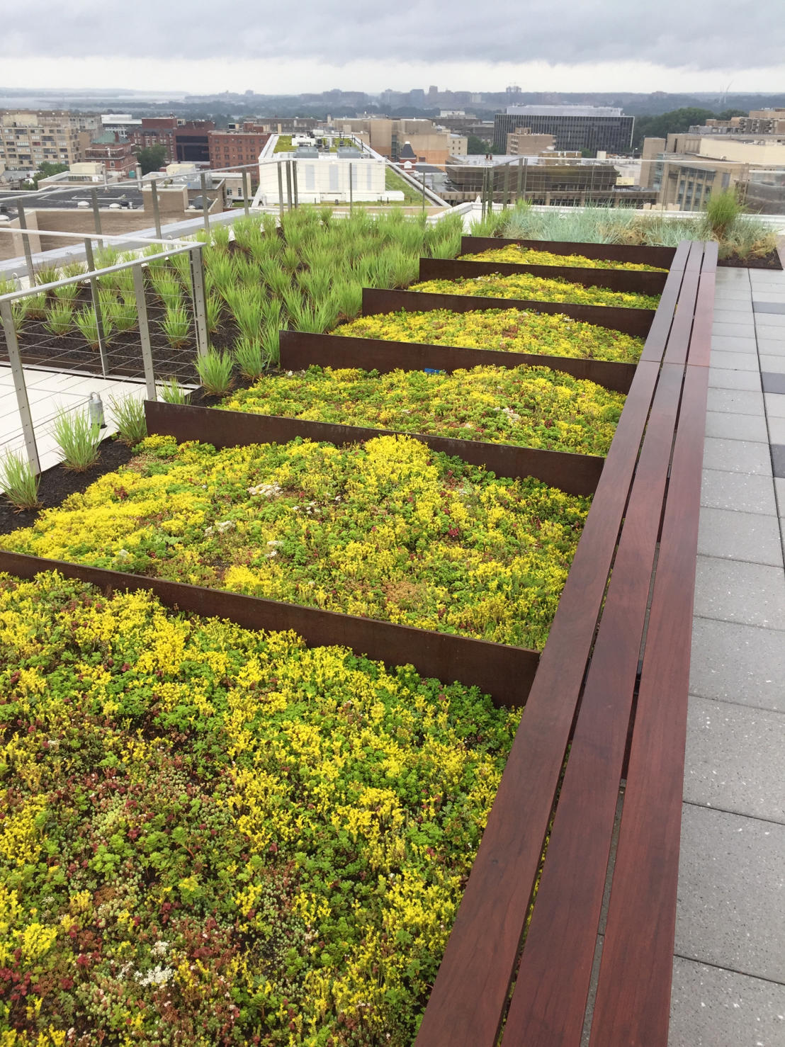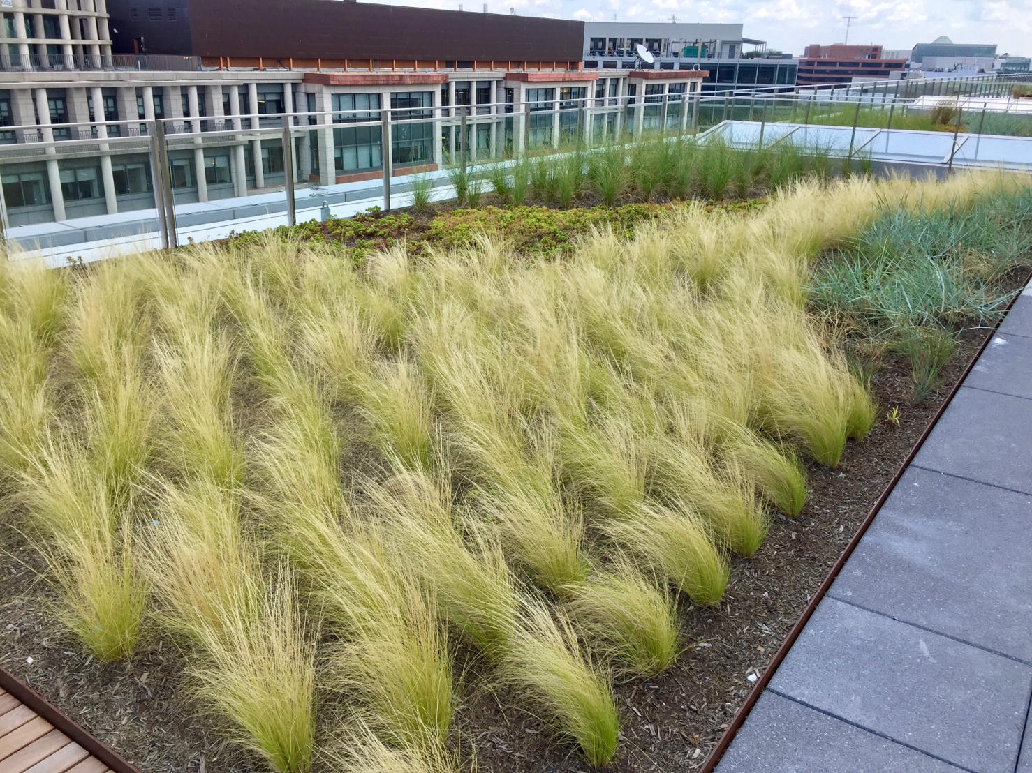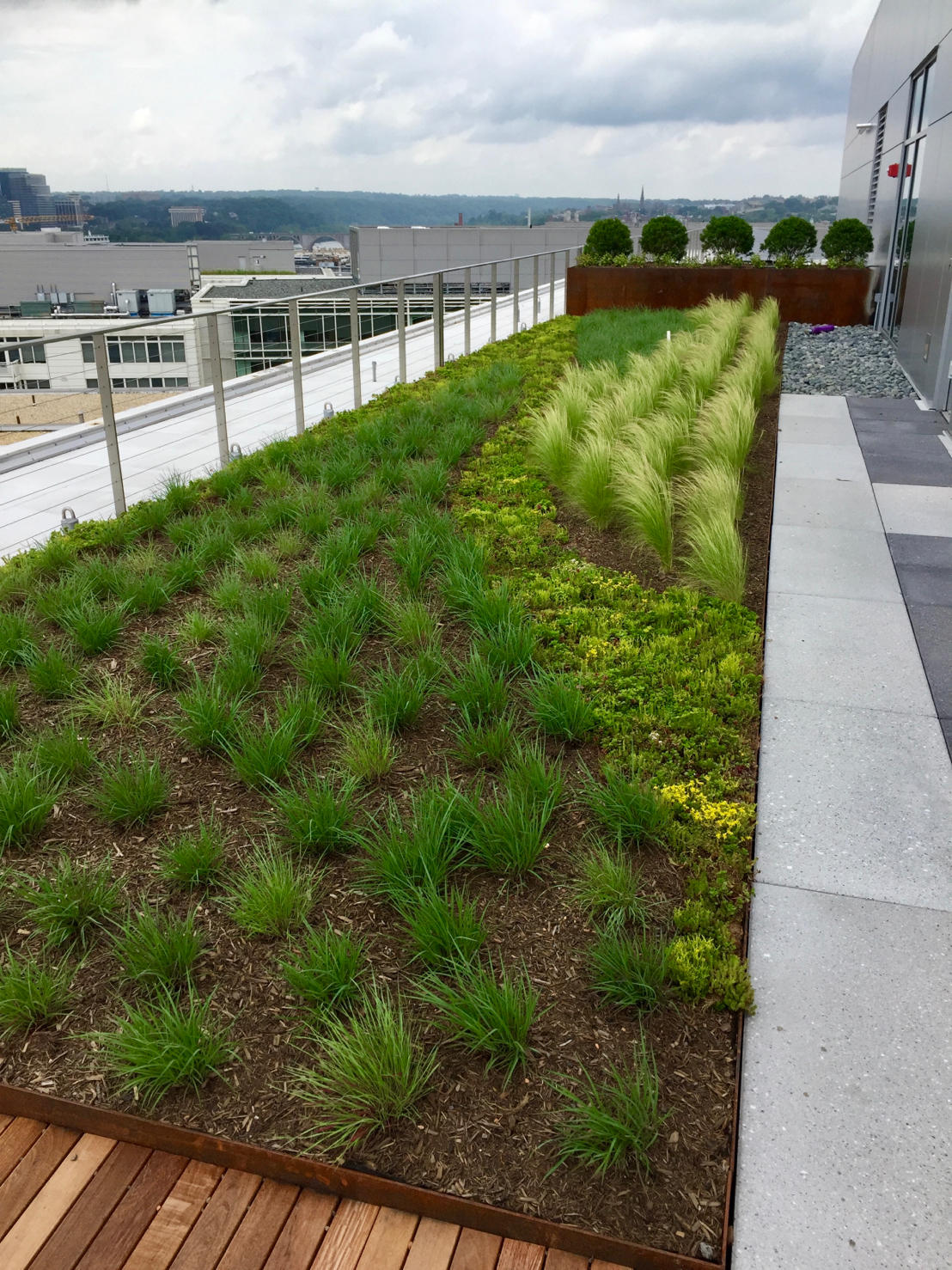2018Monolithic Membrane 6125 keeps this structure watertight and allows for landscape design to be incorporated because it brings a peace of mind that the structure will not leak. The beautiful vegetated roof incorporated Hydrotech's Garden Roof and Ultimate Assembly components. Large swaths of ornamental grasses and InstaGreen Sedum Carpet expanded the plant palette, which provide a soft backdrop to the concrete, steel, and wood hardscape elements.