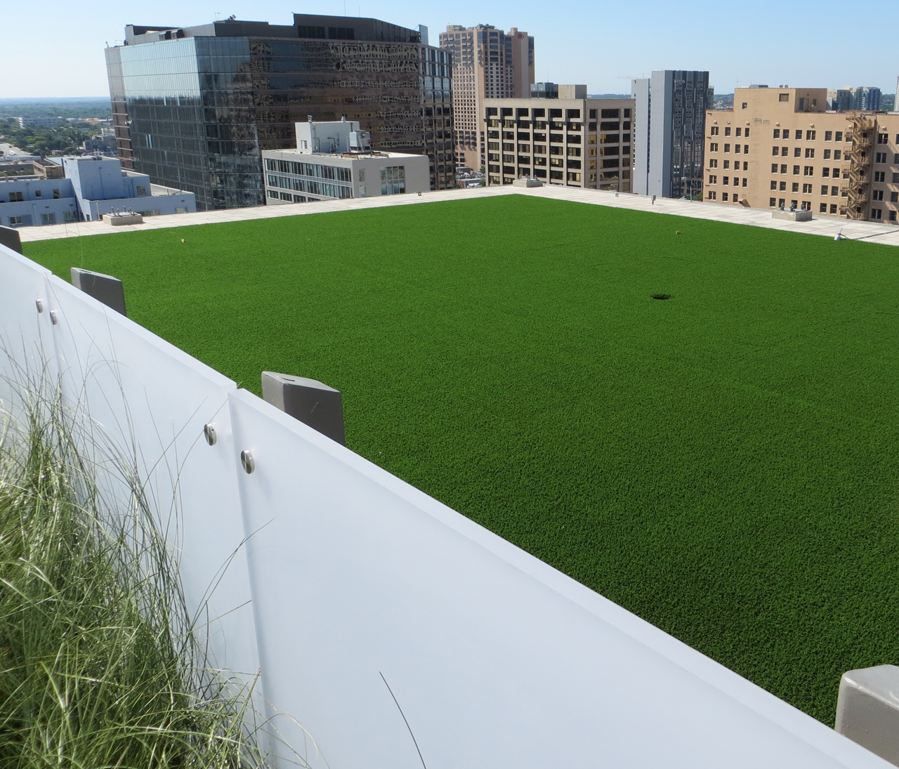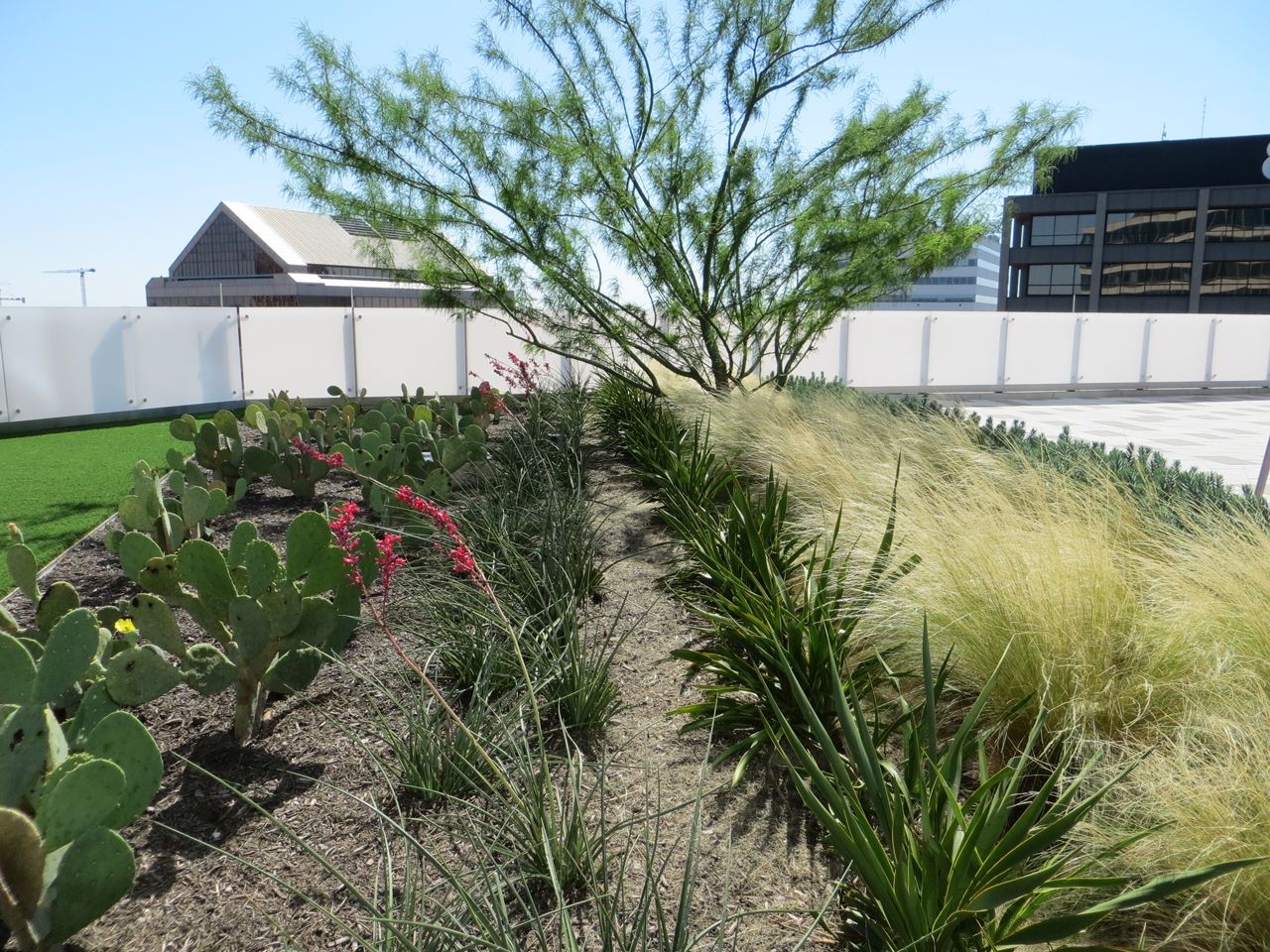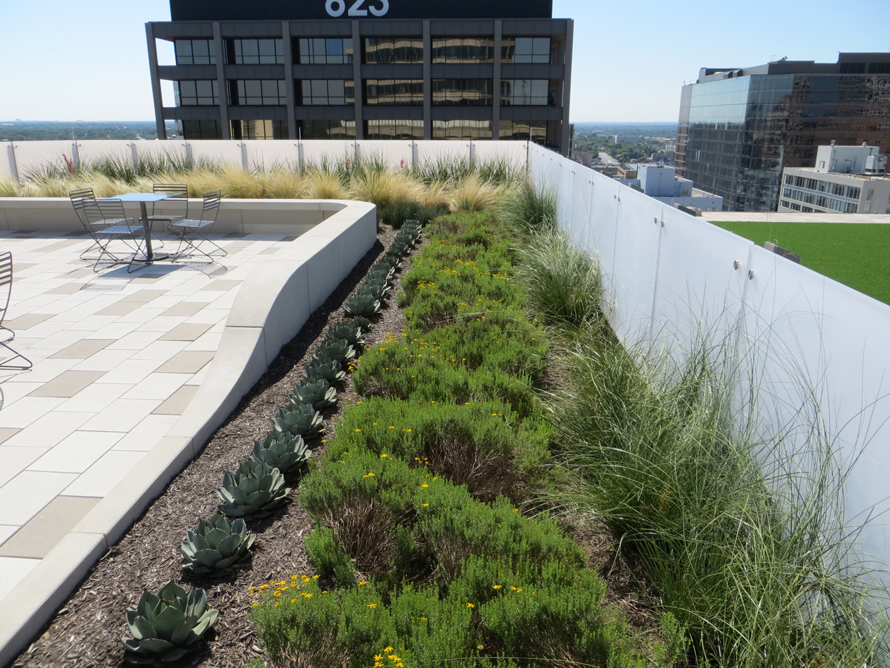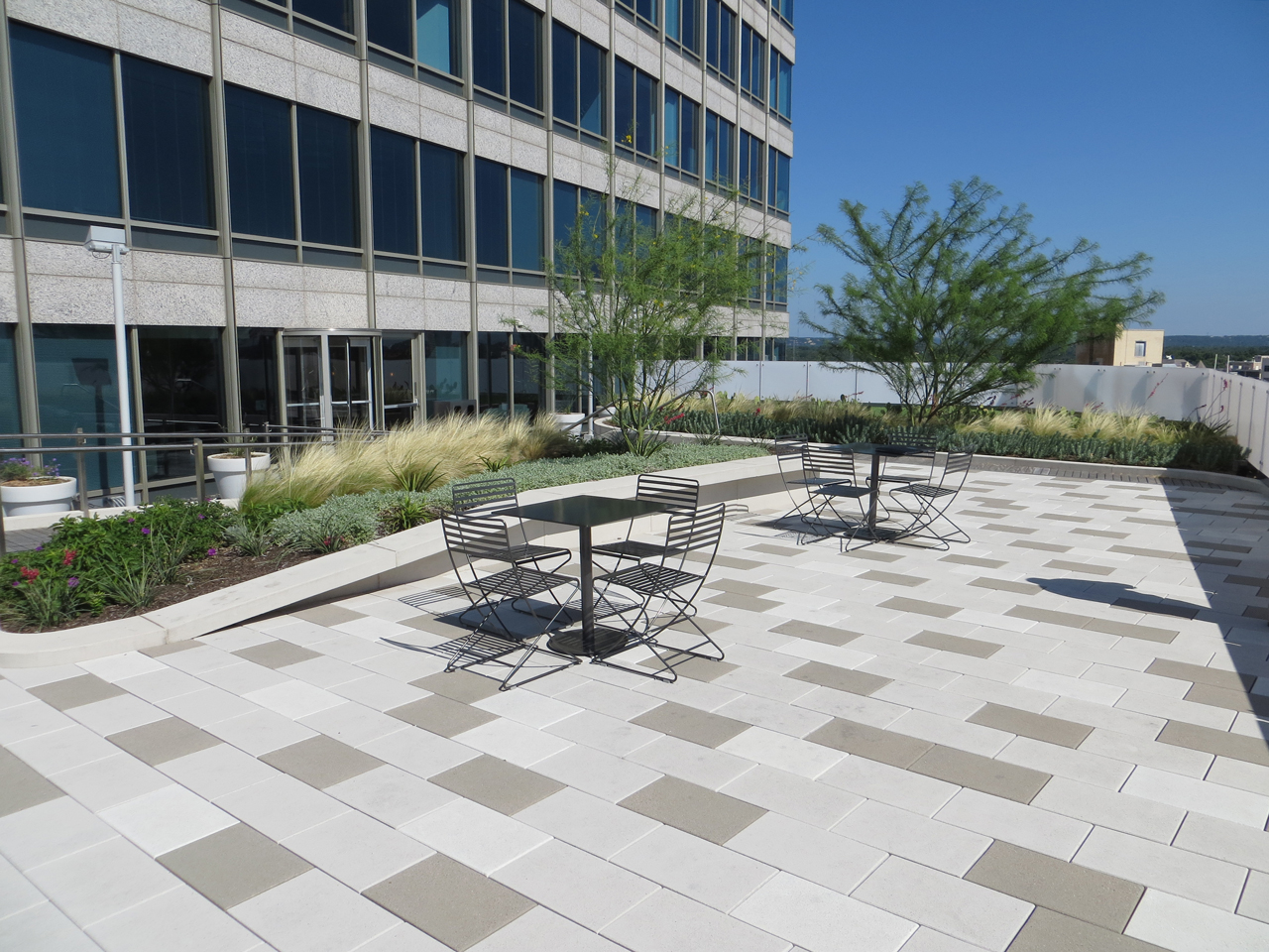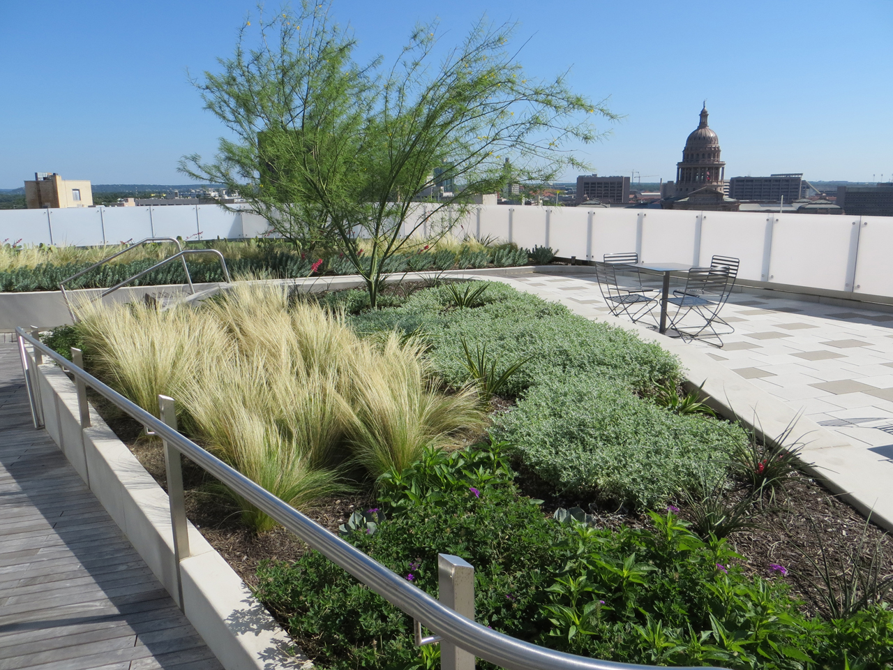 2013The design and construction team at 816 Congress in downtown Austin, TX transformed existing, inaccessible roof space into green roof amenity space for the building tenants. The unsightly rooftop space was converted to usable space for tenants and offers an impressive event space with incredible views of the Texas State Capitol. To accommodate the extra load of the new amenity space, an elevated steel deck was installed.
