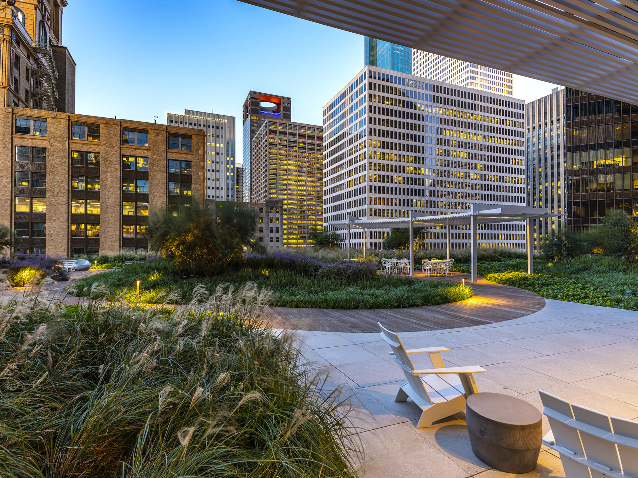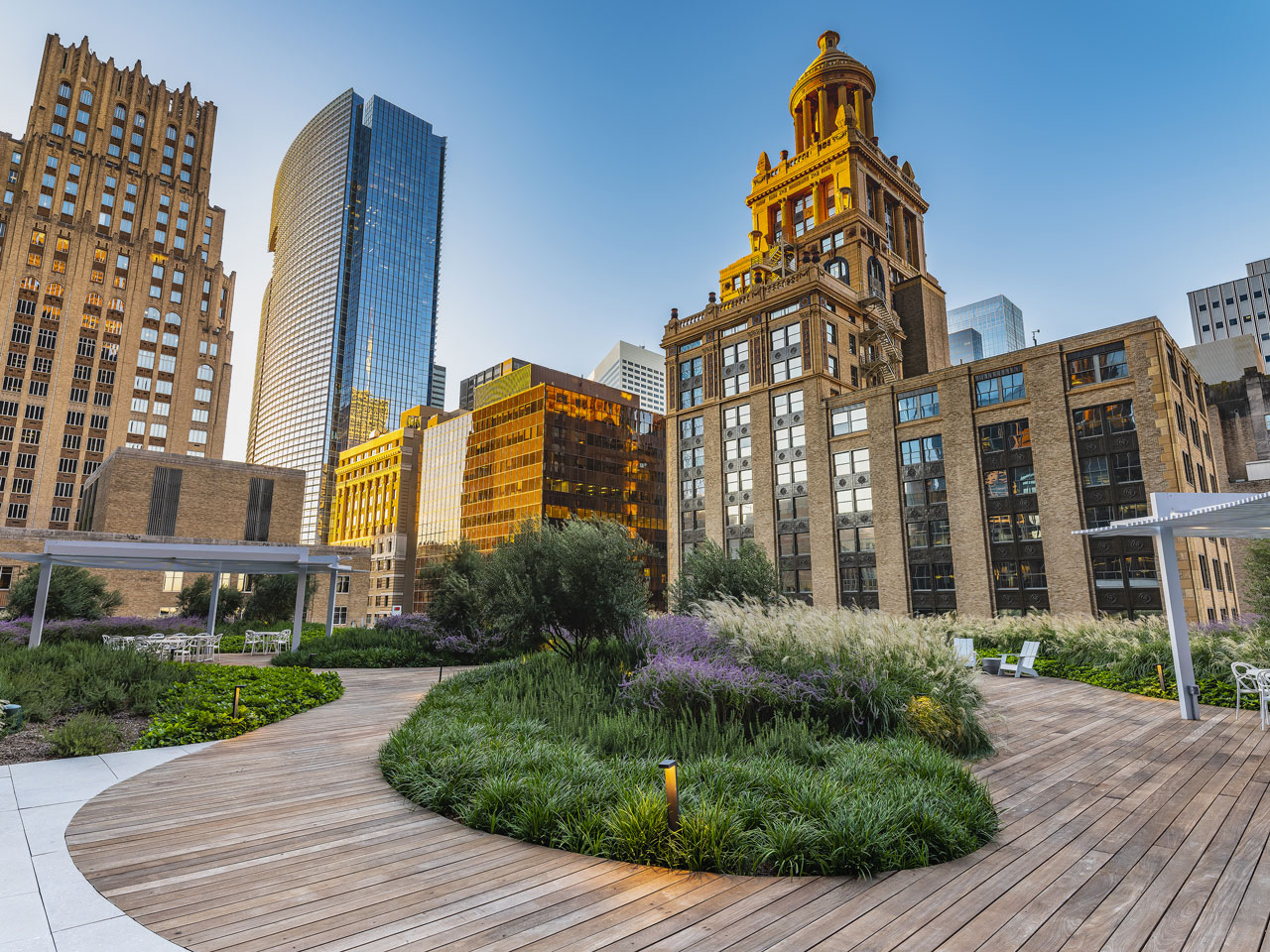 The recently completed Bank of American Tower in Downtown Houston features an Intensive Garden Roof Assembly and Ultimate Assembly that will not only provide a wonderful outdoor space for tenants but will also help mitigate the urban heat island effect and help manage stormwater.