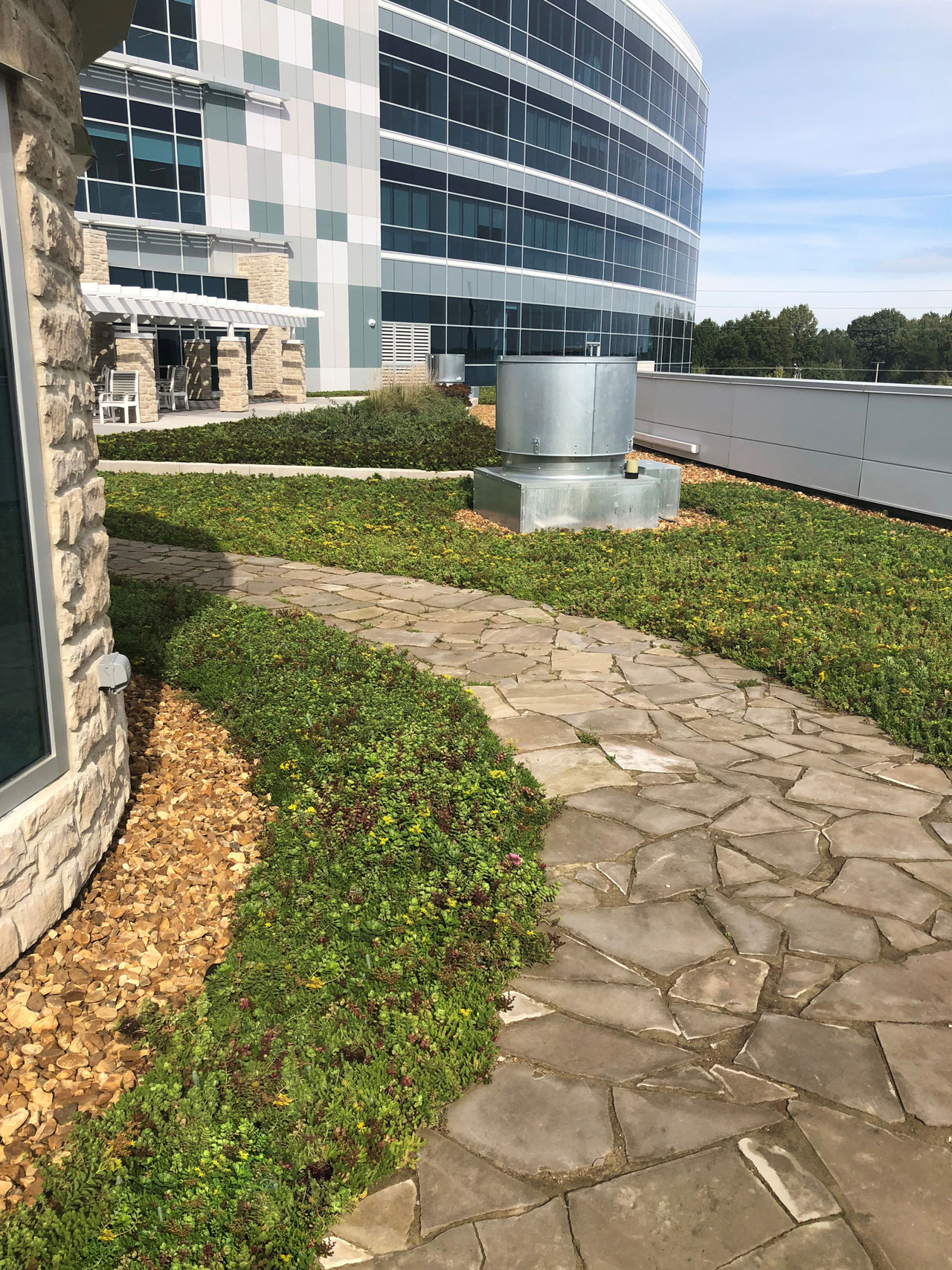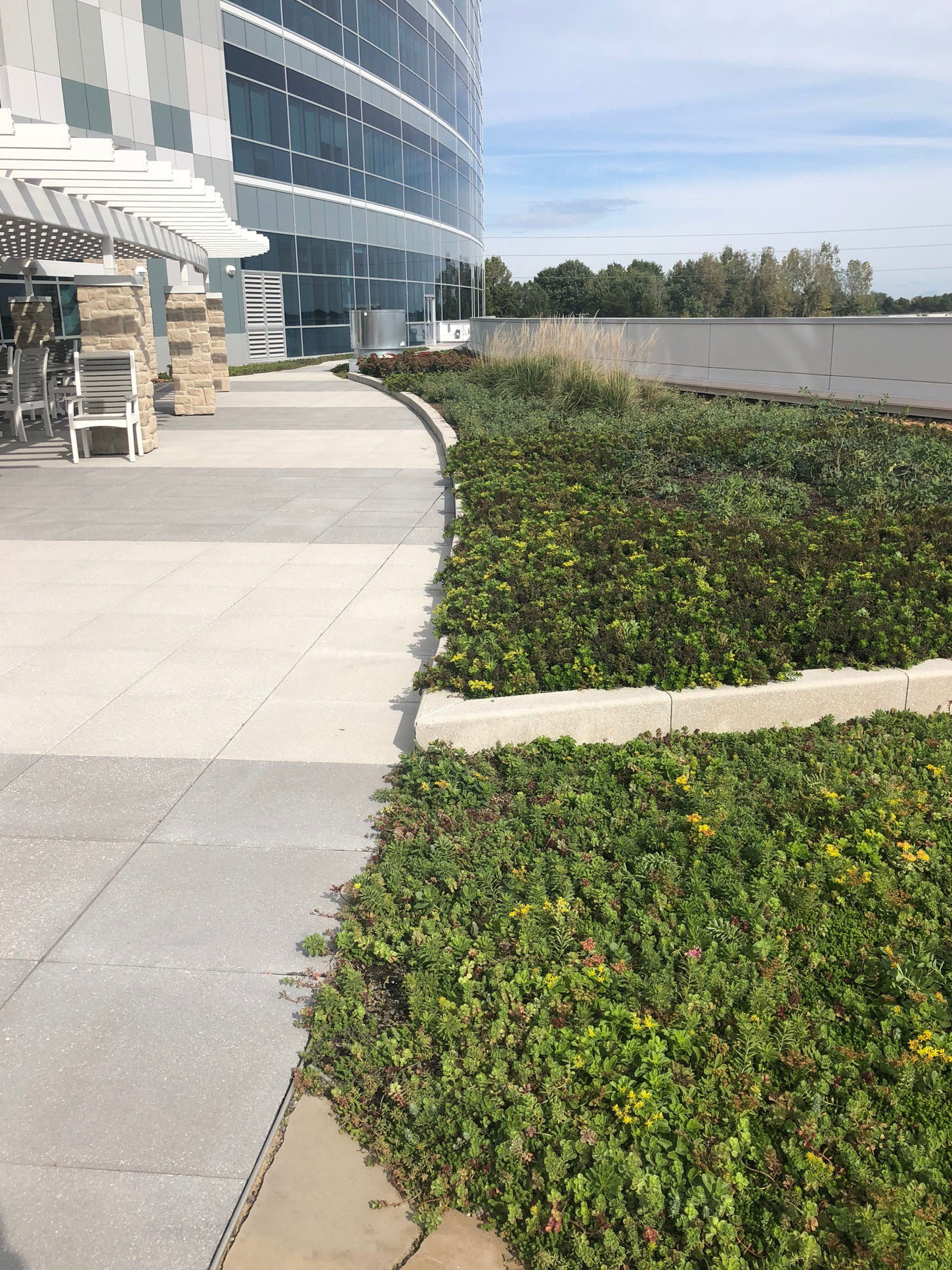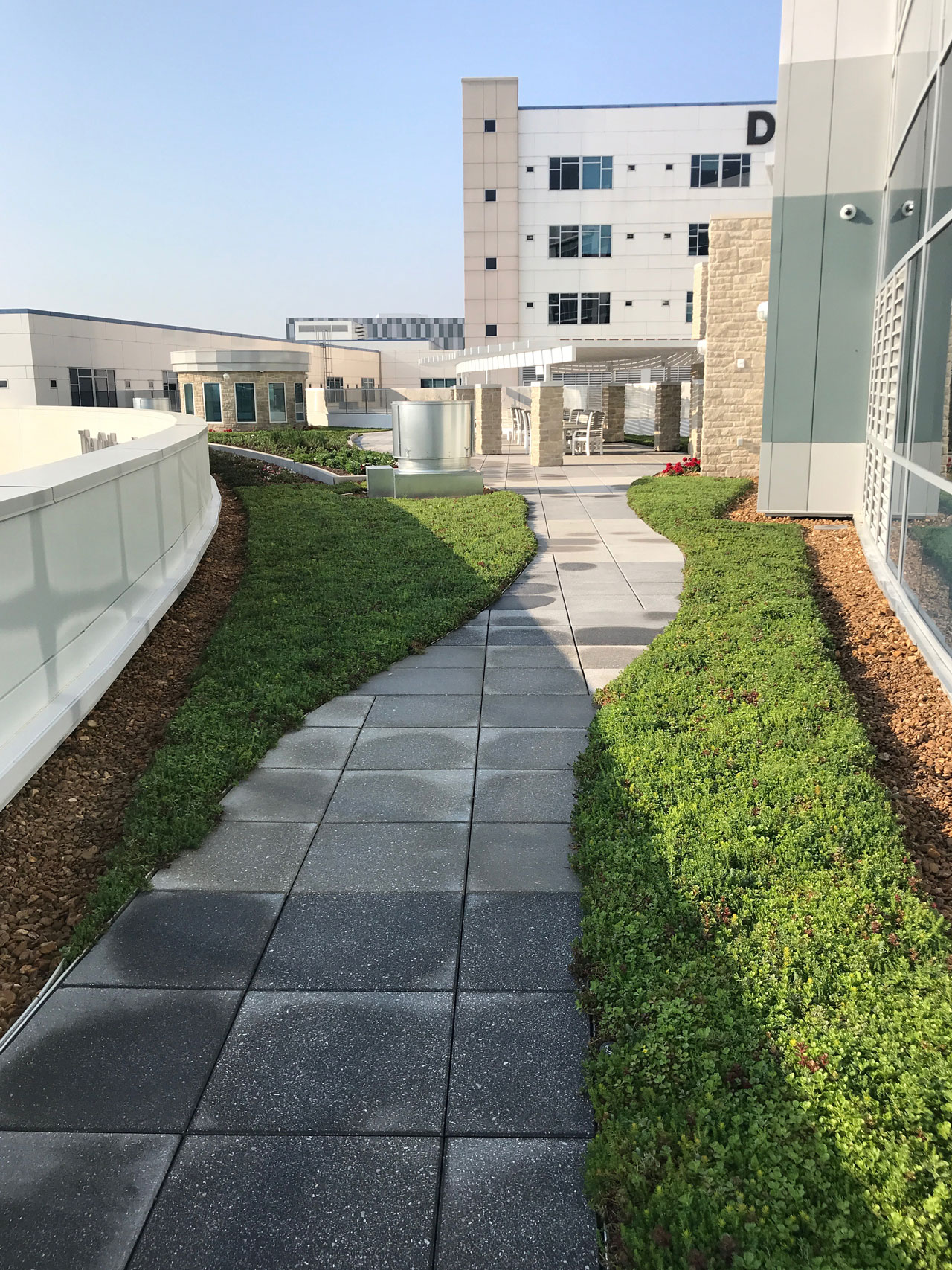 This state-of-the-art facility is home to a 10,500 square foot Hydrotech Garden Roof® and Ultimate® Assembly, which is kept watertight by Monolithic Membrane 6125®. Visitors are encouraged to utilize the hospital’s spacious amenity deck, which is open year-round. The amenity deck seamlessly transitions from green roof to usable space, and the rooftop vegetation features Hydrotech’s InstaGreen® Tile.