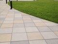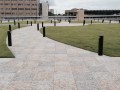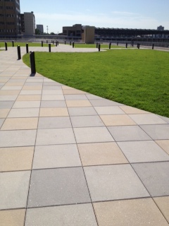 The unique pattern of pavers is achieved with the combination of Limestone Gray, Cream and Natural color pavers. This project exemplifies the possibilities of combining hardscape and softscape into a Protected Membrane Roof.