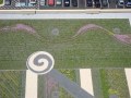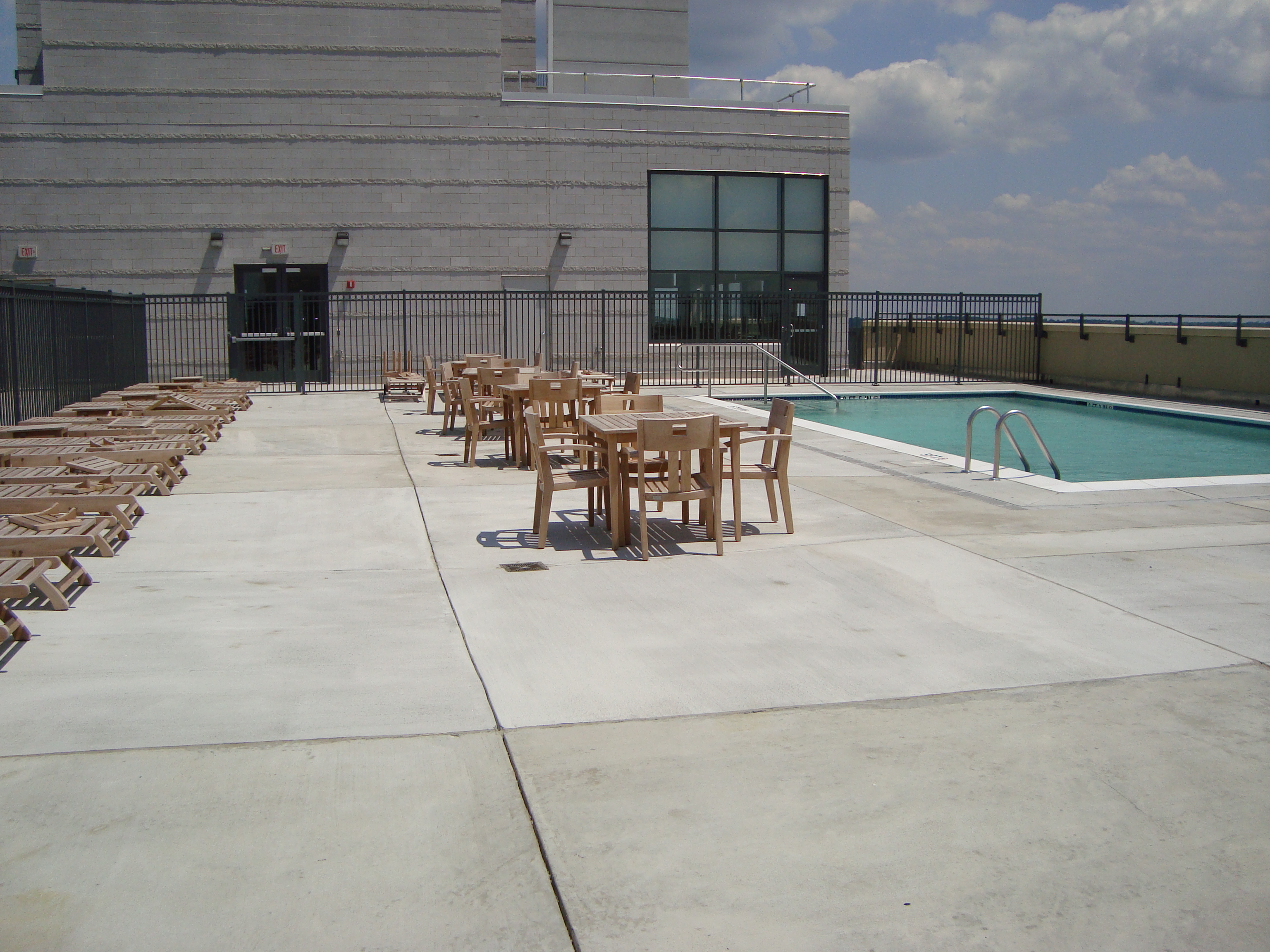 Atop a ground level retail establishment, a courtyard type layout features a combination of sedum, grasses and a wide array of plant species of various sizes and colors, all in a compelling landscape design that serves as a visual amenity for residents of the adjacent tower housing unit.
