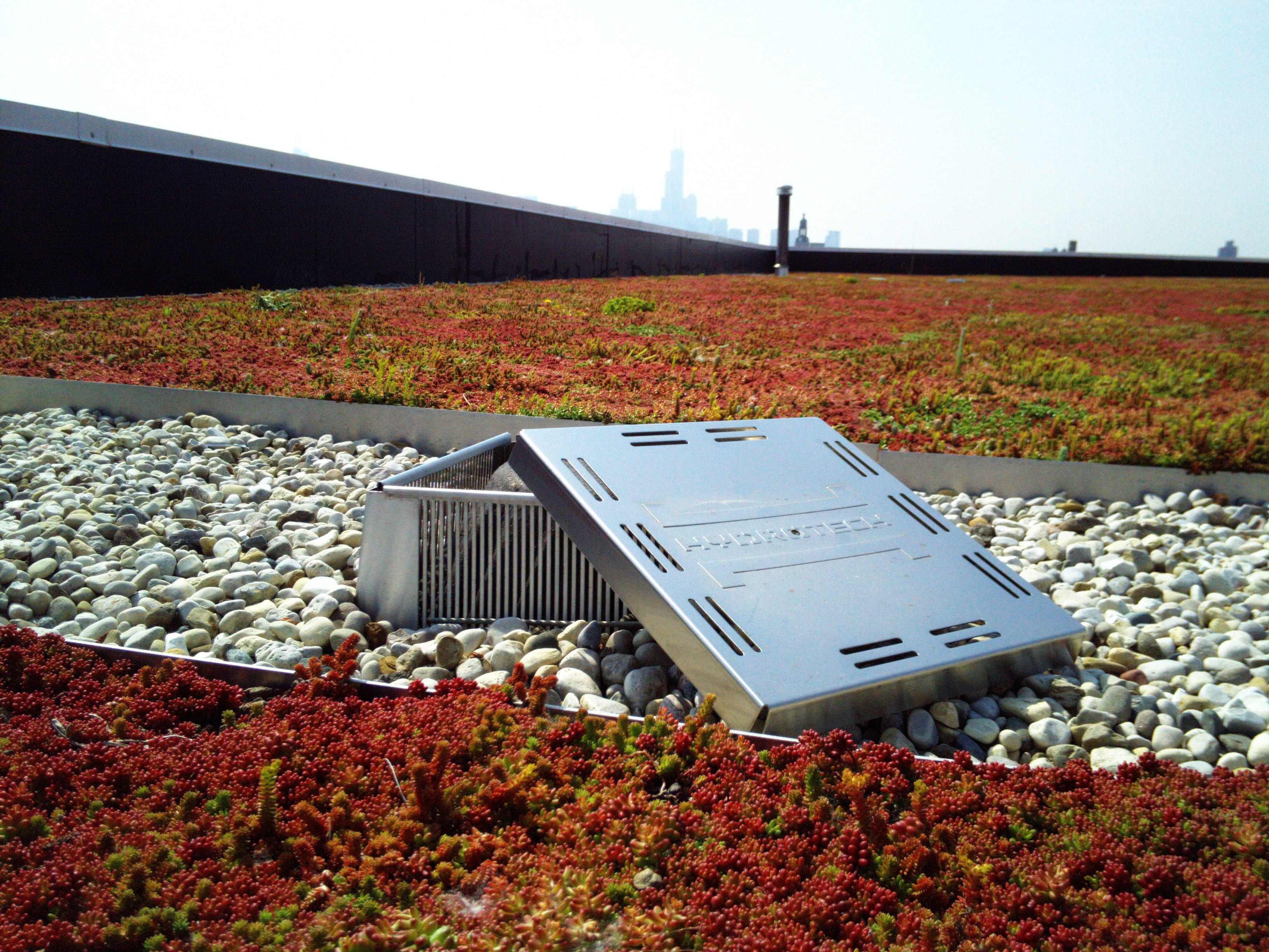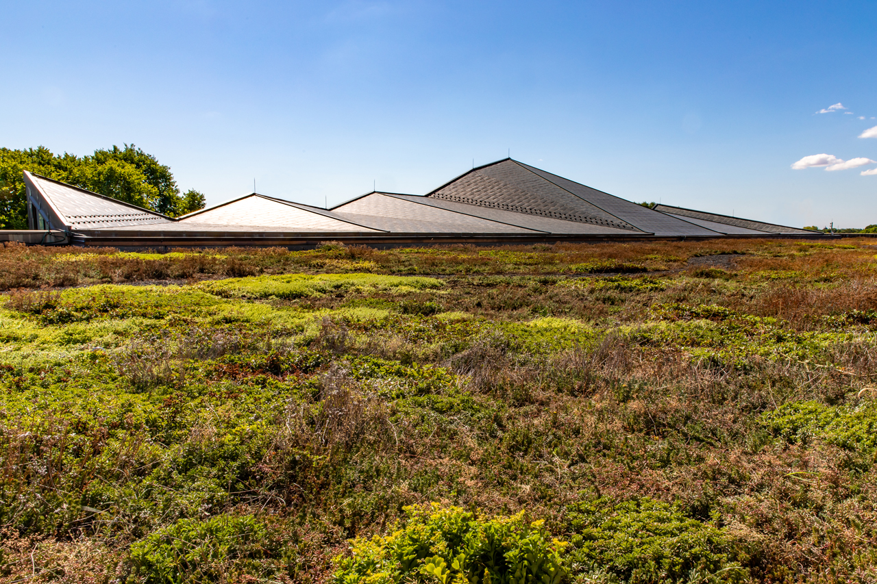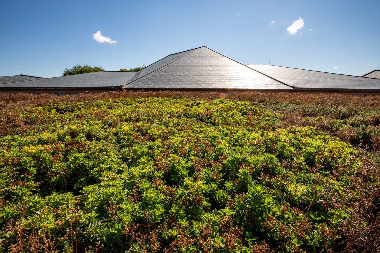 A major design goal for the library was to minimize the impact on the environment through the use of sustainable building materials and systems. Towards this goal, designers decided upon an extensive Garden Roof®, with a 4-inch soil mix and low-growing hardy plants to create a vegetated rooftop that can hold up to the harsh environment without using irrigation. Thanks to the relatively low weight of Hydrotech's Garden Roof Assembly, no additional roof support was necessary.